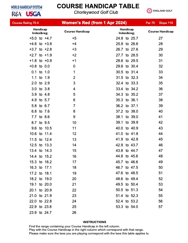 Handicap Table - Ladies red tees