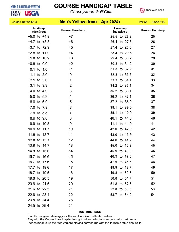 Handicap Table - Yellow tees