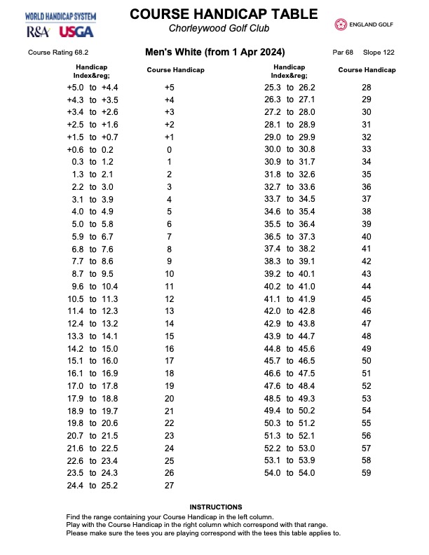 Handicap Table - White tees